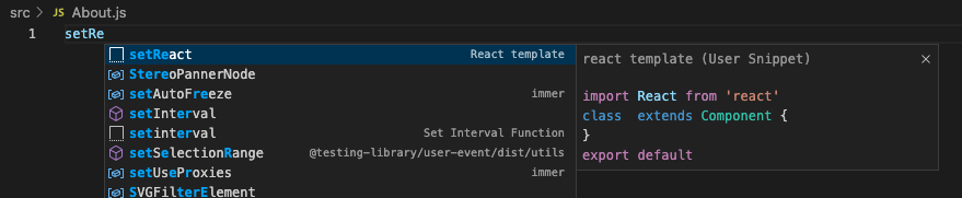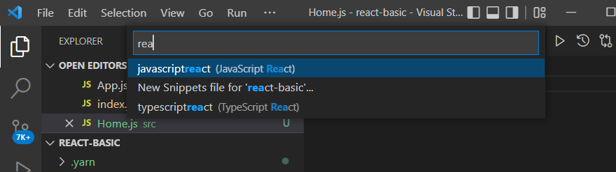 react를 입력하면 이렇게 자바스크립트 리액트가 뚜둥