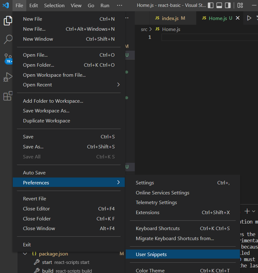 Visual Code로 들어가서 file -> preferences -> user snippets